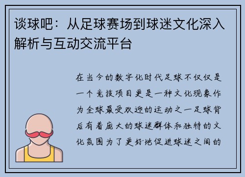 在当今的数字化时代,足球不仅仅是一个竞技项目,更是一种文化现象。作为全球最受欢迎的运动之一,足球背后有着庞大的球迷群体和独特的文化氛围。为了更好地促进球迷之间的互动与交流,"谈球吧"应运而生,它不仅是一个足球赛事信息平台,更是一个集深度解析、即时互动与球迷文化传播于一体的综合平台。本文将从四个方面详细解析"谈球吧":从足球赛场到球迷文化的深度探索与互动交流平台的特点,分别是:1) 足球赛场的赛事解析,2) 球迷文化的构建与发展,3) 互动平台的功能设计,4) 社交影响力与用户体验。通过对这四个方面的阐述,本文旨在揭示"谈球吧"如何成为现代足球文化的重要载体,以及它如何影响足球赛事的关注度与球迷的互动方式。
