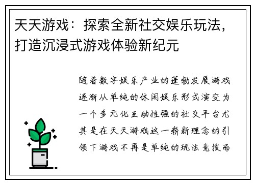 随着数字娱乐产业的蓬勃发展,游戏逐渐从单纯的休闲娱乐形式,演变为一个多元化、互动性强的社交平台。尤其是在“天天游戏”这一崭新理念的引领下,游戏不再是单纯的玩法竞技,而是成为了一种沉浸式的社交娱乐体验,激发了玩家更深层次的情感交流与互动。本文将围绕“天天游戏:探索全新社交娱乐玩法,打造沉浸式游戏体验新纪元”展开讨论,首先介绍其基本概念及背景,接着从游戏社交化、娱乐互动的创新、沉浸式体验的构建以及社交功能的未来趋势四个方面对其进行深入剖析,最终为游戏行业的发展提供一条新的思路。
