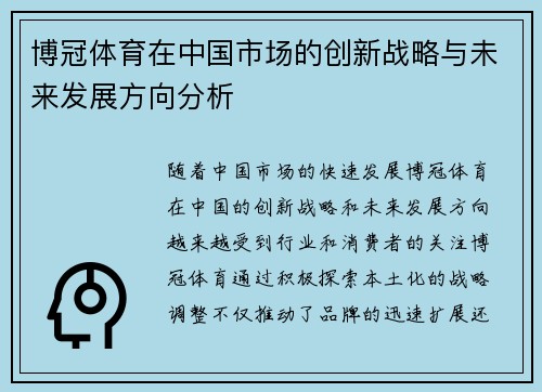未来,博冠体育将在中国市场继续深化创新,不断提升品牌的市场竞争力。同时,博冠体育也将通过科技、文化和市场多维度的融合,进一步推动品牌的全球化发展。相信在不久的将来,博冠体育能够在全球体育产业中占据更加重要的位置。