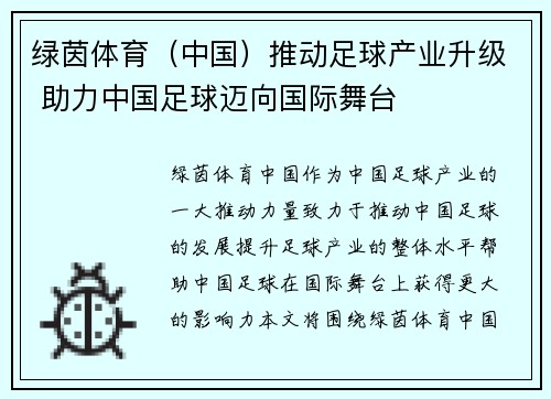 绿茵体育(中国)作为中国足球产业的一大推动力量,致力于推动中国足球的发展,提升足球产业的整体水平,帮助中国足球在国际舞台上获得更大的影响力。本文将围绕绿茵体育(中国)如何推动足球产业升级,从四个方面进行详细阐述:一是通过青训体系建设为中国足球培养新一代人才;二是通过引进国外先进管理模式和技术提升整体水平;三是通过加强与国内外俱乐部、赛事的合作,提高竞技水平;四是通过足球文化的推广,提升全民参与度。通过这些措施,绿茵体育(中国)不仅为中国足球的未来奠定了坚实的基础,也为中国足球走向国际舞台提供了有力的支持。