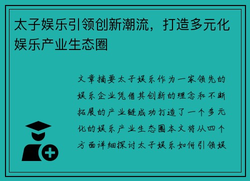 文章摘要:太子娱乐作为一家领先的娱乐企业,凭借其创新的理念和不断拓展的产业链,成功打造了一个多元化的娱乐产业生态圈。本文将从四个方面详细探讨太子娱乐如何引领娱乐行业的创新潮流,涵盖其在内容创作、跨界合作、技术创新及全球布局等方面的策略。首先,太子娱乐在内容创作方面通过原创性和多元化的内容迎合了不同受众的需求。其次,跨界合作成为太子娱乐拓展影响力的重要途径,涵盖了多个行业,形成了协同效应。第三,技术创新是太子娱乐能够持续引领行业潮流的关键,尤其是在虚拟现实和人工智能领域的应用。最后,全球化布局使得太子娱乐能够与世界范围内的娱乐企业竞争并占据一席之地。本文通过详细的分析,旨在为读者展示太子娱乐如何通过创新驱动,构建出一个充满活力和前景的娱乐产业生态圈。